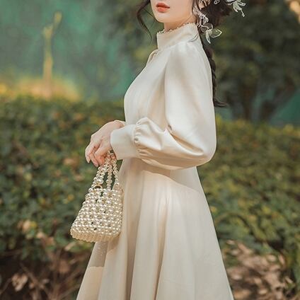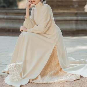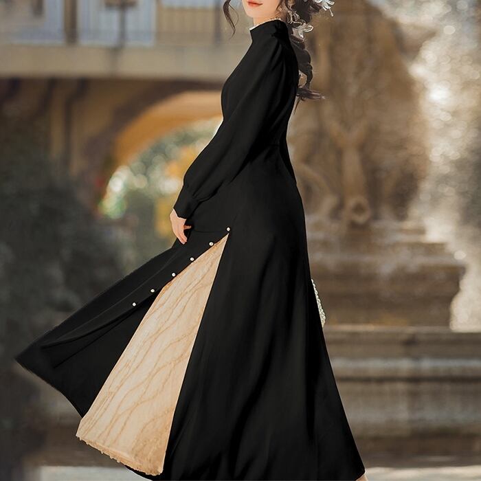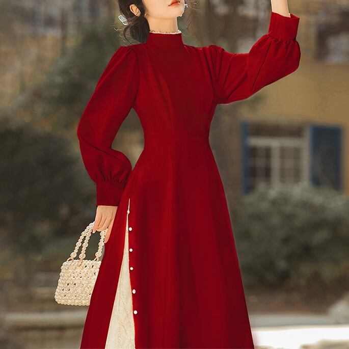 ドレス レディース ワンピース フレアスカート フレアワンピース ワンピドレス マキシ丈 袖あり 長袖 パフスリーブ ハイウエスト スタンドカラー 切り替えデザイン レース スリット ドッキング フレアシルエット レイヤードスタイル 異素材MIX かわいい レトロ ラブリー キュート ガーリー 主役級 スイート ロマンティック 甘め 無地 春 秋 冬 結婚式 二次会 披露宴 10代 20代 30代 デート お出かけ パーティー イベント 韓国 S M L XL 黒 ブラック ワインレッド アプリコット