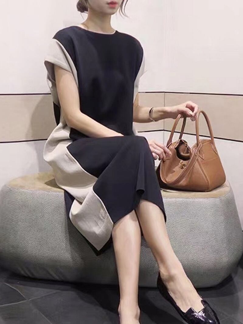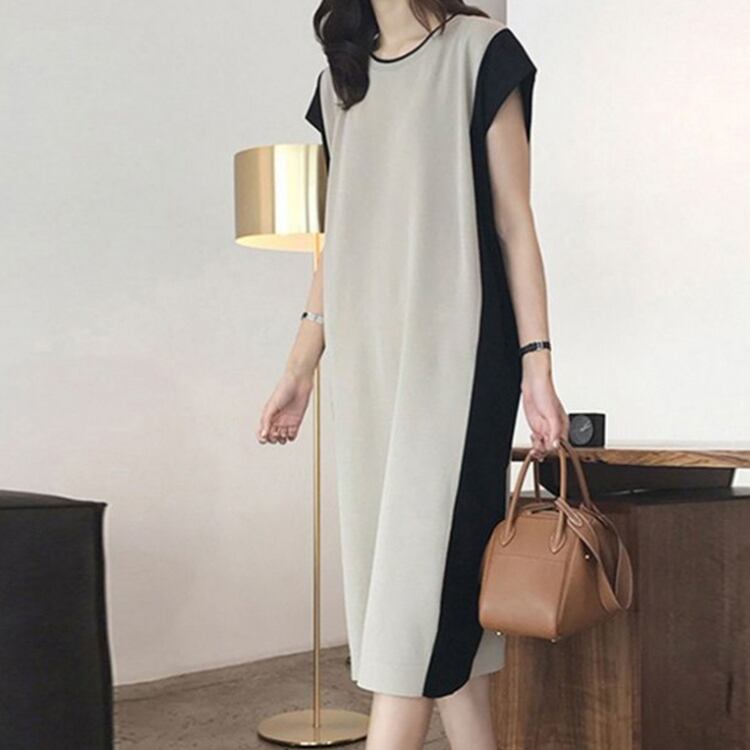 ワンピース レディース ミディアム丈 ひざ下丈 ラウンドネック 半袖 バイカラー トレンド 細見え ストレート Hライン ゆったり 体型カバー おしゃれ 大きいサイズ シンプル 大人女子 大人可愛い フェミニン レトロ クール きれいめ カジュアル キレカジ 着回し ナチュラル 着痩せ 春 夏 新作 送料無料 お出かけ 通勤 オフィス デート ショッピング ランチ カフェ 女子会 旅行 S M L XL 2XL ブラック アプリコット 20代 30代 40代 50代