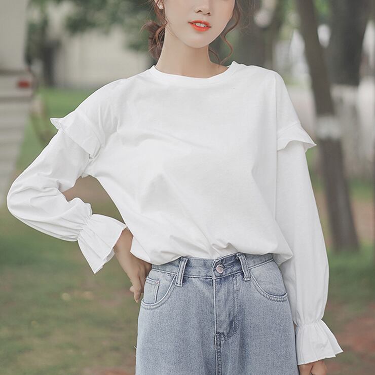 レディース 長袖カットソー 無地 プレーン フレアスリーブ フリル シャーリング ルーズ 長袖 ゆるかわ 襟なし ラウンドネック トレンド ゆったり 大人可愛い カジュアル ナチュラル ラフ ラブリー キュート レトロ シンプル かわいい 韓国 春 夏秋 通勤 OL 上品 通学 休日 お出かけ 女子会 普段使い定番 着回し 重ね着 散歩 旅行 送料無料 10代 20代 30代 体系カバー インスタ映え M L ホワイト ブラック インスタ映え 主役級 モテ 愛され