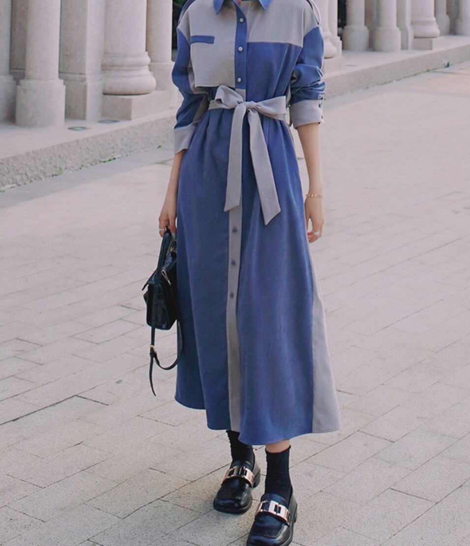 ウエストリボン デニムシャツロングワンピース ブルー 青 フェミニン 大人女子 青 女子会 美シルエット ブロック配色 普段着 普段使い 通勤 通学 ゆったり ハイウエスト 長袖 襟付き ポロ襟 フロントボタン ウエストベルト バイカラー 長袖 ポケット シンプル 無地 デート お出かけ 旅行 カッコいい 切り替え Aライン 体型カバー おしゃれ オシャレ お洒落 人気 着やせ 大きいサイズ対応 韓国風 20代 30代 40代 50代 XS、S、M、L、XL 春夏 レディースファッション