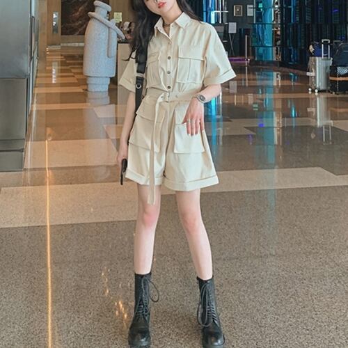 オールインワン レディース ジャンプスーツ シャツカラー フロントボタン 半袖 袖バックル ビッグポケット ショートパンツ ワイドレッグパンツ ウエストマーク ベルト付き トレンド ゆったり ラフ ルーズ おしゃれ 折り返し 着痩せ 楽ちん リラックス 脚長効果 大人女子 キュート 大人可愛い アクティブ 作業服 カジュアル 春 秋 新作 送料無料 お出かけ 普段使い デイリー おうちコーデ カフェ ランチ ショッピング リゾート 休日 S M L XL 2色展開 ベージュ 黒 10代 20代 30代