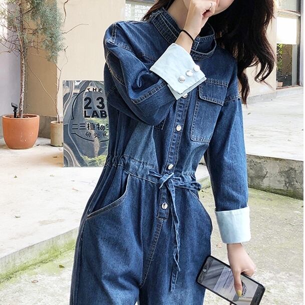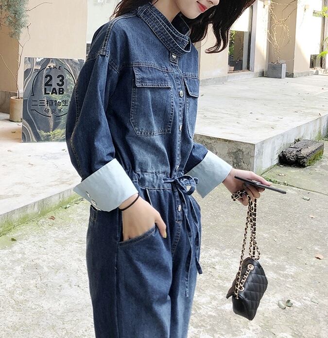 オールインワン レディース ジャンプスーツ デニム スタンドカラー フロントボタン 長袖 折り返し ワイドパンツ デニムパンツ ウエストマーク ベルト付き トレンド ゆったり ラフ ルーズ おしゃれ 折り返し 着痩せ 楽ちん リラックス 脚長効果 大人女子 メンズライク アクティブ 作業服 カジュアル 春 秋 新作 送料無料 お出かけ 普段使い デイリー おうちコーデ カフェ ランチ ショッピング リゾート レジャー 休日 ストリート S M L XL デニムブルー 10代 20代 30代