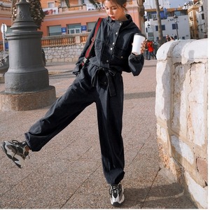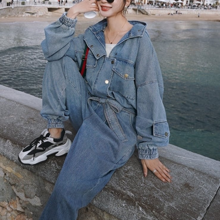 オールインワン レディース ジャンプスーツ デニム フード付き フロントボタン フーディー 長袖 パフスリーブ ワイドパンツ デニムパンツ ウエストマーク ウエストリボン ウエストゴム トレンド ゆったり ラフ ルーズ おしゃれ お洒落 体型カバー 着痩せ 楽ちん リラックス 脚長効果 大人女子 メンズライク アクティブ 作業服 カジュアル 春 秋 新作 送料無料 お出かけ 普段使い デイリー カフェ ランチ リゾート レジャー 休日 ストリート S M L ブルー ブラック 10代 20代 30代
