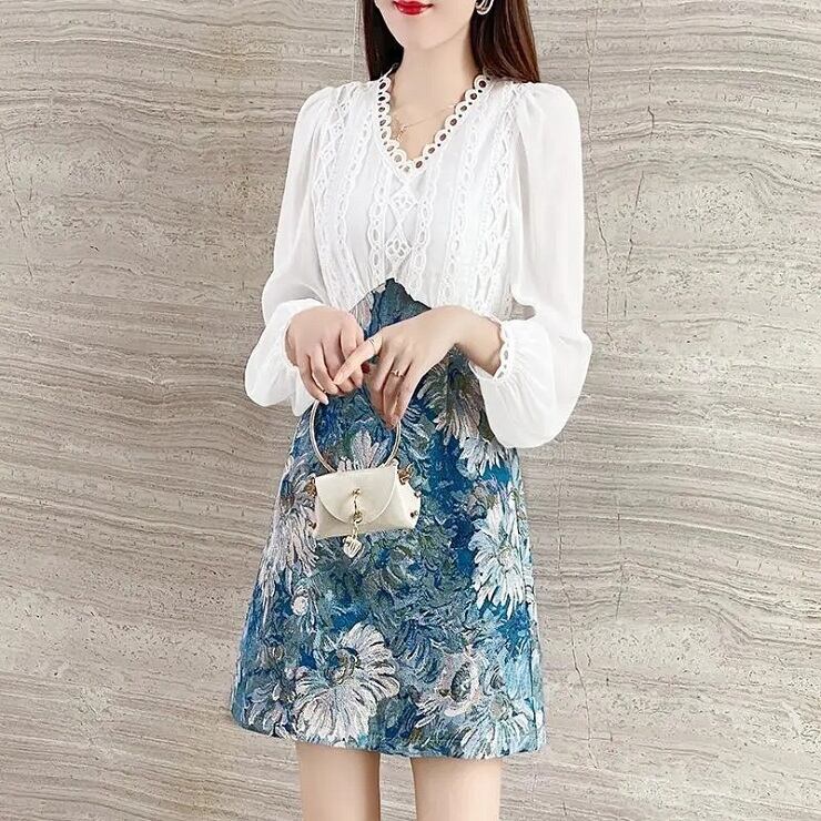 トップス レディース レース ブラウス ワンピース Vネック ホワイト春 白 ブルー 花柄 スカート フレンチレディースランタンスリーブ スリムワンピース 長袖 パフ袖 S M L XL 2XL 袖コンシャス 大人女性 通勤 通学 きれい目 サマ見え こなれ感 おとなかわいい おしゃれ オシャレ 着やすい プルオーバー エレガント ミニ丈 Aラインスカート 好印象 上品 サマ見え こなれ感 細見え 華奢見え エレガント 映えアイテム 足長効果 スタイルUP モデルライク カジュアル お出かけ デート