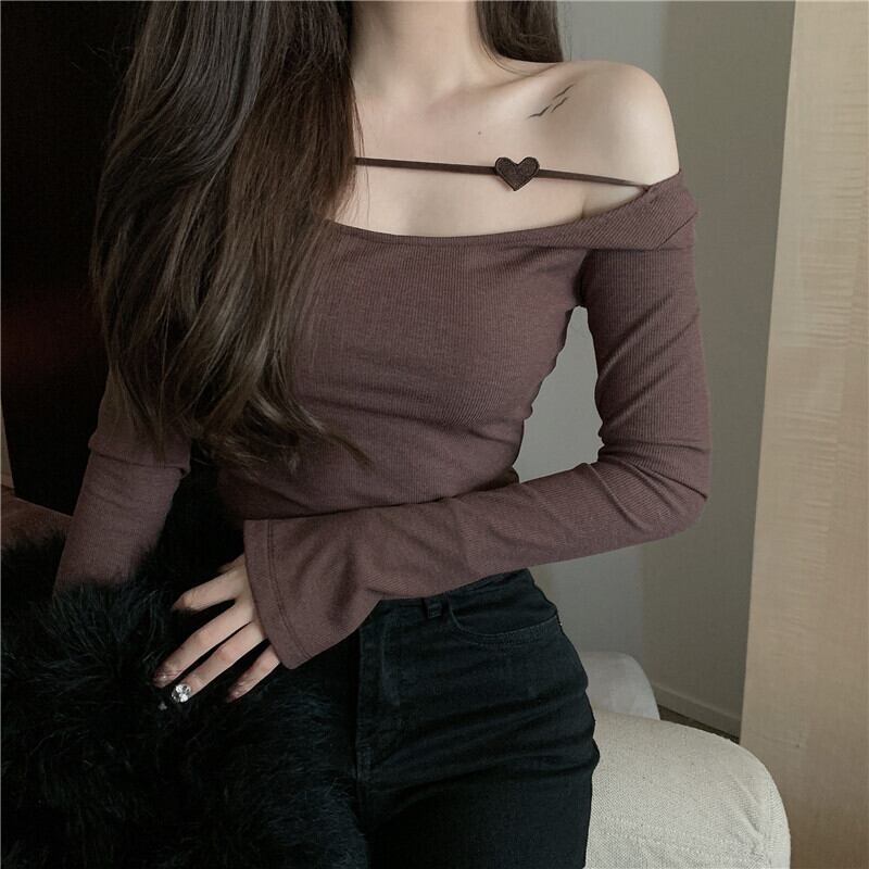 トップス レディース Tシャツ カットソー ラウンドネック ハート付きストラップ 長袖 ミディアム丈 オフショルダー ソフトフィット トレンド 大人女子 大人可愛い キュート セクシー フェミニン 可愛い 体型カバー 着痩せ おしゃれ きれいめ カジュアル キレカジ 着回し お洒落 春 秋 新作 送料無料 普段使い デイリー お出かけ デート 女子会 リゾート 休日 旅行 バカンス ワンサイズ フリーサイズ 2色展開 ブラウン ブラック 10代 20代 30代 40代