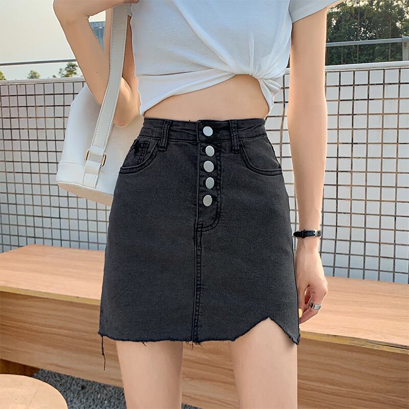 フロントのボタンのデザインとスリットがポイントのハイウエストデニムスカートです。
