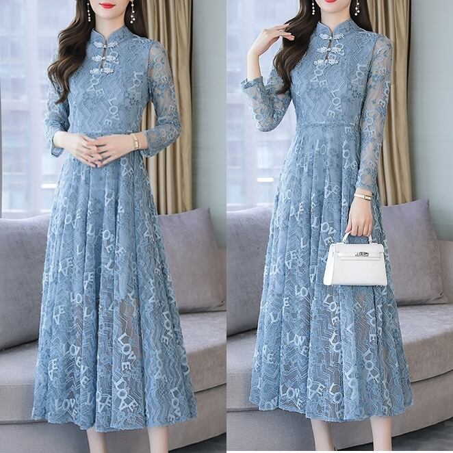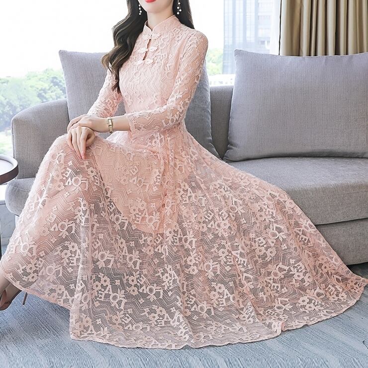 ワンピース レディース ドレス 総レース ロングワンピース スタンドカラー チャイナカラー チャイナ風 長袖 透け感 ハイウエスト ロング丈 フレア Aライン トレンド レトロ クラシカル 上品 エレガント おしゃれ フェミニン かわいい キュート 脚長効果 大人女子 大人可愛い きれいめ 細見え 春 秋 新作 送料無料 お出かけ パーティー お呼ばれ イベント 結婚式 二次会 発表会 食事会 大きいサイズ M L XL 2XL 3色展開 ピンク ホワイト ブルー 20代 30代 40代 50代
