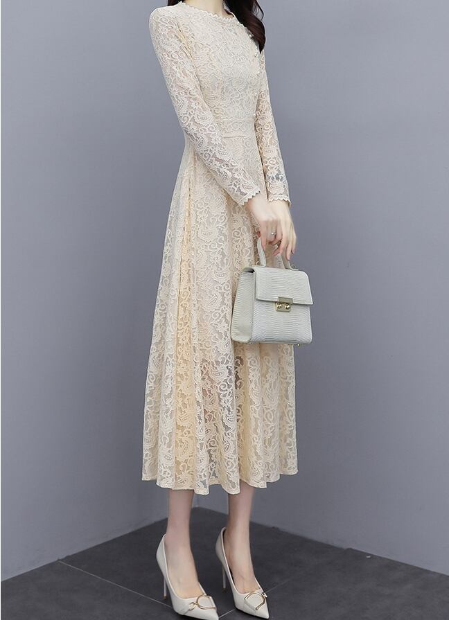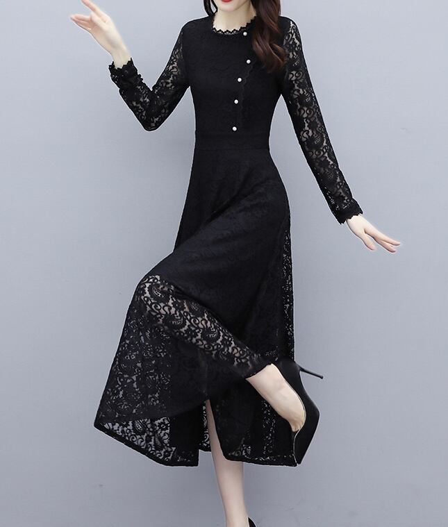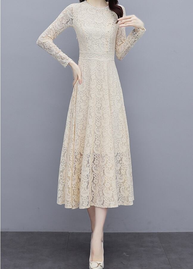 ワンピース レディース ドレス 総レース 花柄レース ロング丈 ひざ下丈 ラウンドネック スカラップ 長袖 透け感 パールボタン ハイウエスト フレア Aライン トレンド レトロ クラシカル シック 上品 エレガント おしゃれ フェミニン 大人っぽ 脚長効果 クール 大人女子 大人可愛い きれいめ 細見え 春 秋 新作 送料無料 お出かけ パーティー お呼ばれ 結婚式 二次会 発表会 食事会 フォーマル 大きいサイズ M L XL 2XL 2色展開 ブラック アプリコット 20代 30代 40代