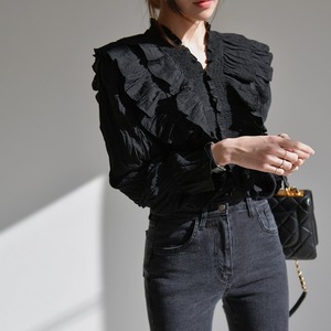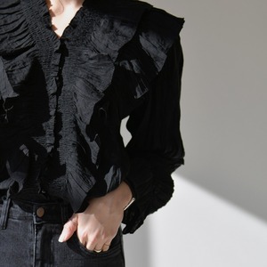 肩からフロント、袖口にあしらったフリルデザインが大人可愛いシャツブラウス。