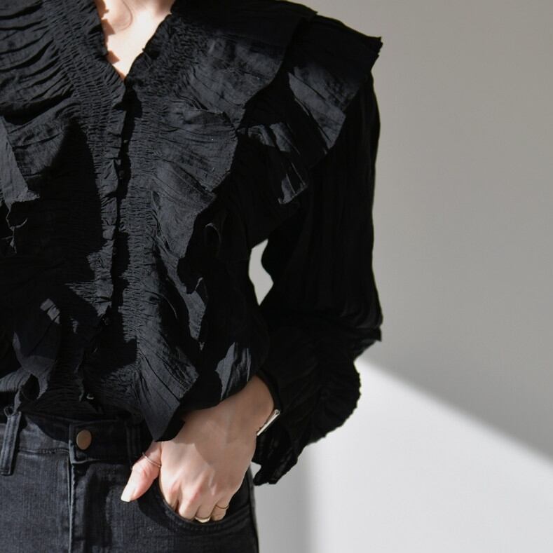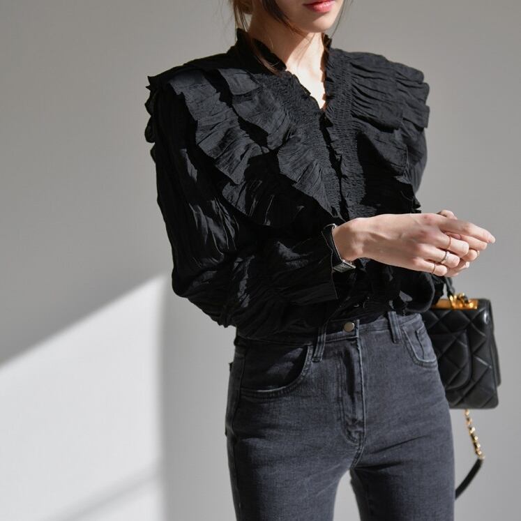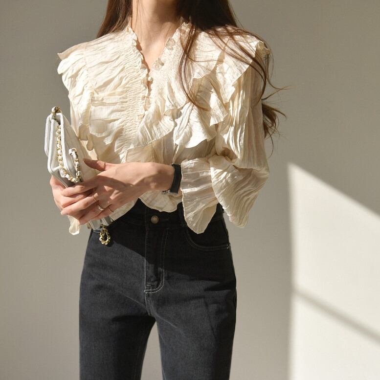 トップス レディース シャツ ブラウス フリル ラッフル しわ加工 プリーツ Vネック 襟付き 無地 長袖 ボリューム袖 キャンディスリーブ ふんわり トレンド 大人女子 ガーリー かわいい 大人可愛い キュート 大人女子 体型カバー 着痩せ エレガント フェミニン おしゃれ きれいめ カジュアル キレカジ お洒落 春 秋 新作 送料無料 お出かけ デイリー 普段使い デート ランチ 女子会 S M 2色展開 ブラック アプリコット 10代 20代 30代 40代