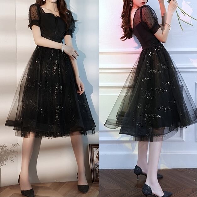 ワンピース レディース ドレス ワンピースドレス スパンコール グリッター キラキラ ドット チュール 透け感 ミディアム丈 ひざ丈 スクエアネック 背中開き 半袖 パフスリーブ フレア Aライン トレンド レトロ エレガント シック おしゃれ フェミニン 脚長効果 大人女子 大人可愛い キュート かわいい 細見え 春 夏 新作 送料無料 きれいめ パーティー 結婚式 二次会 イベント 食事会 衣装 食事会 イブニングドレス XS S M L XL 2XL ブラック 10代 20代 30代 40代