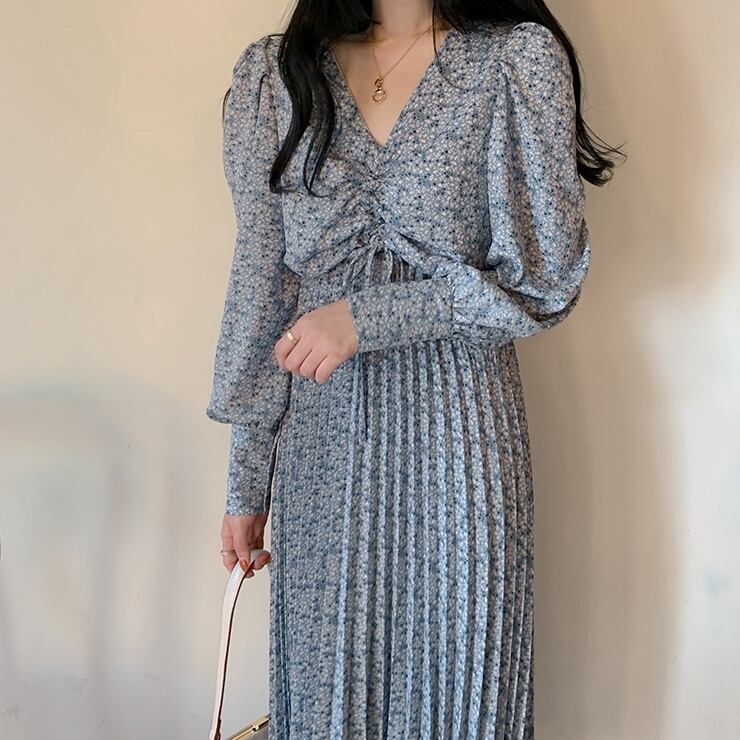 ワンピース レディース プリーツスカート ワンピドレス 膝下 ミモレ丈 長袖 Vネック プリーツドレス 美スタイル 愛されコーデ スカート かわいい 大人可愛い きれいめ 大人 上品 おしゃれ お洒落 レトロ 大人女子 ガーリー 主役級 存在感 小花柄 フラワー 春 10代 20代 30代 レディース 女性用 ママ デート お出かけ 公園デビュー 女子会 休日 普段使い 韓国系 ファッション コーデ スタイル モテ 送料無料 トレンド インスタ映え 黒 ブラック 青 ブルー 大人カラー 春カラー