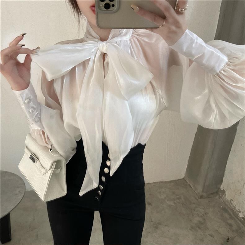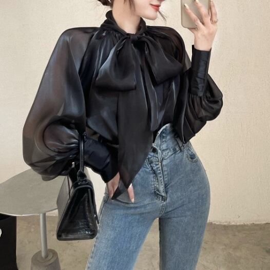 トップス レディース ブラウス リボンタイ ボウタイ シアー 長袖 パフスリーブ ボリューム袖 光沢 ゆったり ビッグシルエット トレンド ふんわり感 透け感 シースルー 大人女子 大人可愛い 大人っぽ エレガント フェミニン 大人女子 体型カバー 着痩せ おしゃれ きれいめ カジュアル 着回し お洒落 春 秋 新作 送料無料 普段使い デイリー お呼ばれ お出かけ デート カフェ ランチ ショッピング 休日 旅行 ワンサイズ フリーサイズ 2色展開 ホワイト ブラック 20代 30代 40代 50代