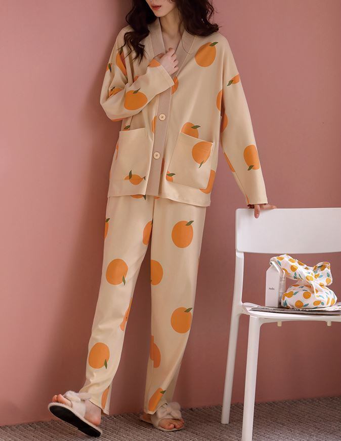 ルームウェア パジャマ レディース 女性用 ママ 部屋着 寝巻き ナイトウェア セットアップ ボトムス Vネック ロングパンツ 長袖 柄 オレンジ 果物 フロントボタン 上下セット 2点セット ツーピース 楽ちん 快眠 快適 かわいい 大人可愛い シンプル カジュアル おしゃれ お洒落 ガーリー ラフ ラブリー キュート ルーズ 春 夏 秋 お泊まり 休日 旅行 2022 新作 送料無料 お揃い トレンド 流行 ベージュ XL 2XL 3XL 4XL 大きいサイズ 10代 20代 30代 40代 50代