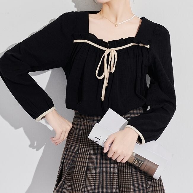 トップス レディース ブラウス カットソー ショート丈 クロップド丈 スクエアネック フリル フロントリボン ストラップ 長袖 バイカラー レトロ こなれ感 上品 大人女子 大人可愛い 大人っぽ フェミニン 体型カバー フレア ふんわり キュート かわいい おしゃれ きれいめ カジュアル キレカジ 着回し お洒落 春 秋 新作 送料無料 普段使い デイリー お出かけ 通勤 通学 デート カフェ ランチ ショッピング 女子会 旅行 S M L ブラック 10代 20代 30代 40代