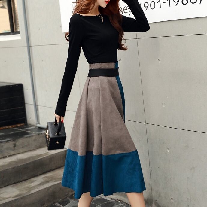 ハイウエストからフレアに広がるAラインのバイカラースカートのセット商品です。