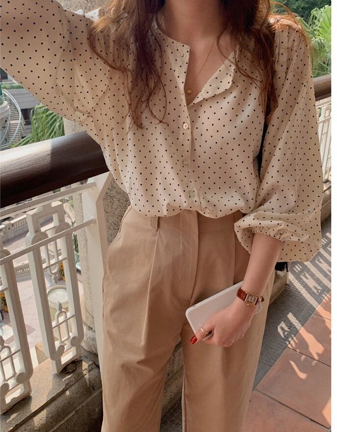 トップス ノーカラーシャツ シャツ ブラウス 袖あり 長袖 Vネック 襟なし 前開き かわいい 大人可愛い シンプル カジュアル 大人 おしゃれ お洒落 レトロ こなれ感 楽ちん ラフ 柄 ドット柄 水玉 春 夏 秋 20代 30代 レディース ビジネス OL 通勤 学生 通学 デート 休日 着回し 着まわし 普段使い 重ね着 万能トップス 送料無料 4サイズ展開 サイズ S M L XL ゆったり 2色展開 黒 ブラック ベージュ 大人カラー 春カラー 秋カラー モノトーン くすみカラー