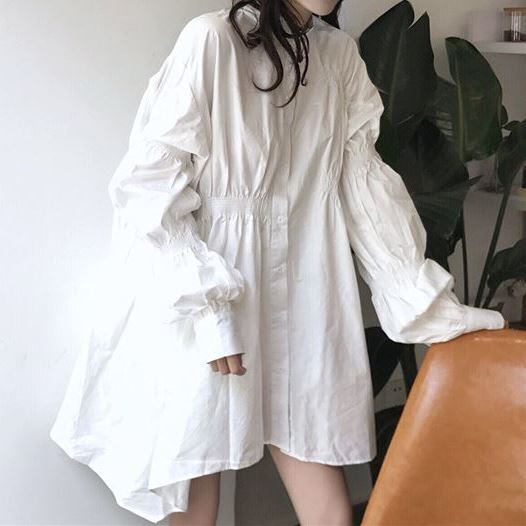 ワンピース レディース チェニック シャツ シャツワンピース ミニ丈 ミニ 膝上 スタンドカラー 長袖 ボリューム袖 パフスリーブ ぽわん袖 無地 レトロ トレンド Aライン ゆったり 大きいサイズ フレア 体型カバー アシンメトリー おしゃれ 大人 かわいい 大人可愛い カジュアル 清楚 フェミニン 上品 ガーリー 韓国 春 夏 秋 冬 オールシーズン シーズンレス 2022 新作 送料無料 お出かけ デート 女子会 普段着 デイリー 着回し 白 ホワイト 10代 20代 30代 40代 フリーサイズ