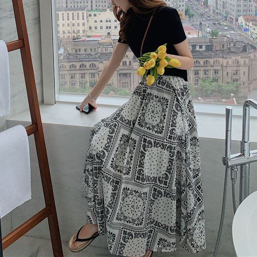スカート レディース ロングスカート フレアスカート ロング ロング丈 ペイズリー柄 総柄 フレア Aライン シフォン ハイウエスト ウエストゴム かわいい 大人可愛い カジュアル 大人 おしゃれ レトロ エキゾチック 大人女子 こなれ感 ラフ キュート ルーズ エレガント ボタニカル プリント 春 夏 秋 シーズンレス 2022 新作 送料無料 10代 20代 30代 40代 ママ デート お出かけ 女子会 休日 リゾート 旅行 海 プール 着回し 普段使い 韓国 楽ちん フリーサイズ 白 黒