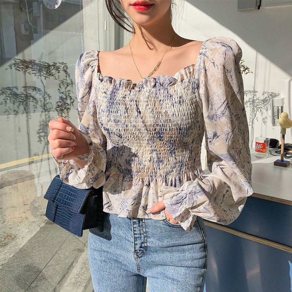 トップス レディース ブラウス プルオーバー シフォン ショート ショート丈 袖あり 長袖 スクエアネック パフスリーブ フレア袖 総柄 ハイウエスト ギャザー シャーリング ペプラム 大きいサイズ スマート 細身 スタイリッシュ 薄手 大人可愛い かわいい カジュアル セクシー フェミニン きれいめ 韓国 キュート ラブリー おしゃれ お洒落 春 夏 秋 2022 新作 送料無料 お出かけ デート 女子会 普段着 デイリー 着回し リゾート 青 ブルー S M L XL 10代 20代 30代 40代