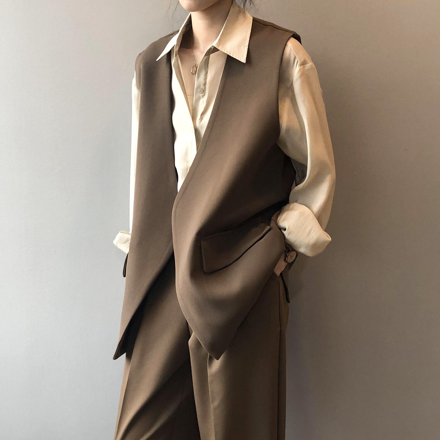 アウター アシンメトリー ベスト 前開き オーバーサイズ スリム 美シルエット Vネック 細見え 大きいサイズ レディース 女性用 ブラック 黒色 ホワイト 白色 ブラウン 茶色 個性的 クール 主役級 存在感 とろみ感 抜け感 上品 楽ちん こなれ感 ラフ カジュアル 韓国風 大人可愛い きれいめ シンプル おしゃれ 着やせ スタイルアップ OL 学生 ママ 10代 20代 30代 40代 50代 デート お出かけ 女子会 休日 アウトドア 入学式 入園式 卒園式 コーデ 定番 送料無料