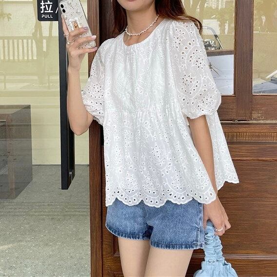 シンプルで上品な着こなしを叶えるコットンレースブラウス♪涼しくて柔らかな生地感が肌にも優しく