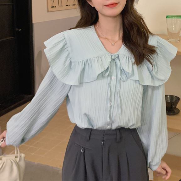トップス レディース シャツ ブラウス 長袖 襟付き ビッグカラー ドールカラー 無地 トレンド フロントボタン リボンタイ ゆったり 大きいサイズ 大きめ ドロップショルダー 体型カバー 薄手 大人可愛い かわいい カジュアル フェミニン ガーリー こなれ感 韓国 キュート ラブリー おしゃれ 上品 清楚 春 夏 秋 冬 オールシーズン シーズンレス 2022 新作 送料無料 お出かけ デート 普段着 デイリー 着回し 白 ホワイト 緑 グリーン フリーサイズ 10代 20代 30代