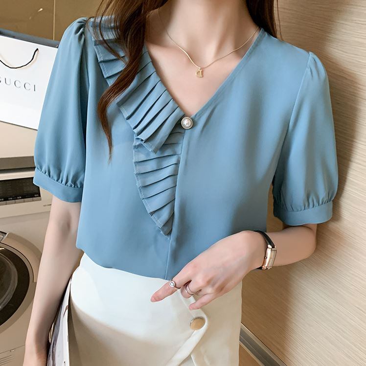 トップス レディース シャツ ブラウス シフォン 半袖 Vネック ノーカラー パフスリーブ ぽわん袖 無地 パールボタン プリーツ フリル 大きいサイズ スマート 細身 スタイリッシュ ドロップショルダー 体型カバー 薄手 大人可愛い かわいい カジュアル フェミニン きれいめ 韓国 おしゃれ 上品 清楚 春 夏 秋 2022 新作 送料無料 お出かけ デート 通勤 オフィス 普段着 着回し ビジネス オフィスカジュアル 白 ホワイト 青 ブルー S M L XL 10代 20代 30代 40代