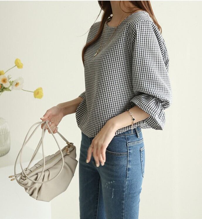 トップス レディース シャツ 7分袖 パフスリーブ ラウンドネック かわいい 大人可愛い きれいめ 大人 上品 おしゃれ お洒落 大人女子 こなれ感 ラフ ガーリー 主役級 存在感 チェック柄 ギンガムチェック 10代 20代 30代 レディース 女性用 ママ オフィス ビジネス 通勤 学生 デート お出かけ 公園デビュー 女子会 休日 着回し 普段使い 重ね着 韓国系 ファッション コーデ スタイル 楽ちん モテ 送料無料 トレンド インスタ映え 黒 ブラック 茶色 ブラウン 大人カラー カラバリ