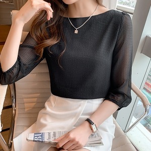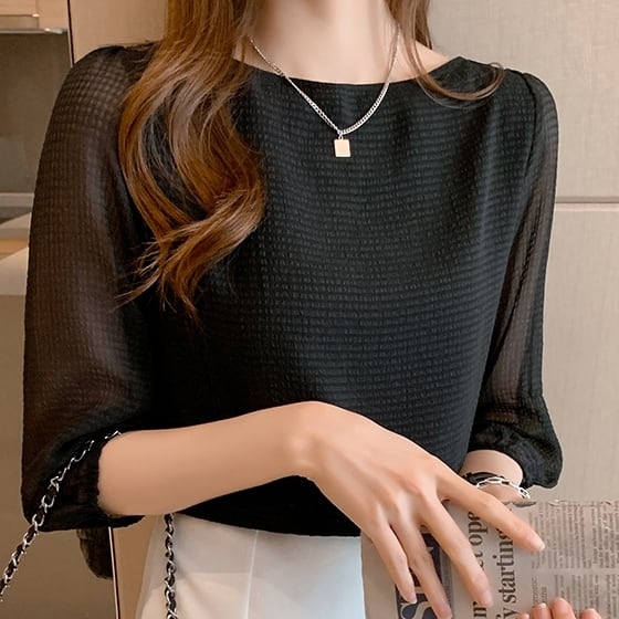 ふんわりと二の腕をかくしてくれる透け感パフスリーブで体型カバーにもなるデザイン◎