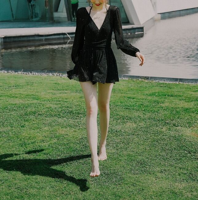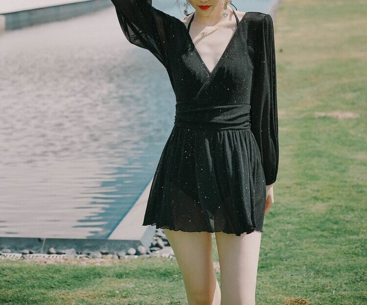 ワンピースタイプの水着です。長袖なので、気になる二の腕をカバーしてくれます。