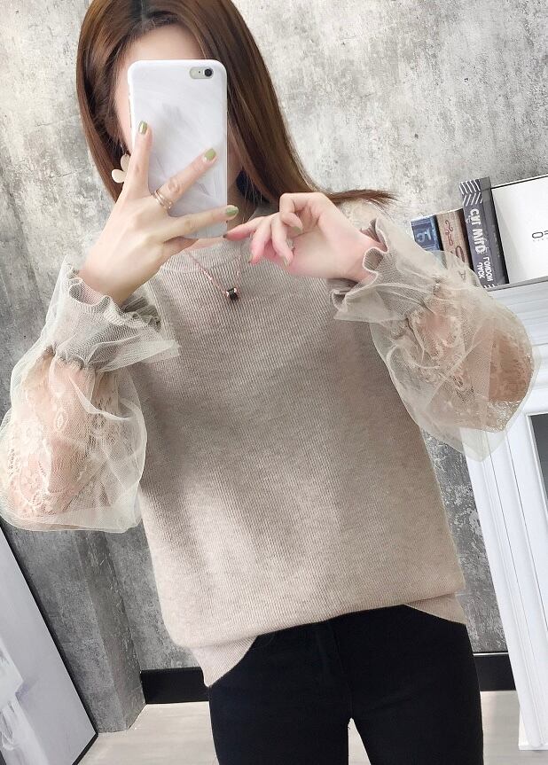 レーススリーブから袖口は絞られているのがキュートポイント♡シンプルなカラーなのでボトムやスカートの色を選ばずコーディネートを楽しめる
