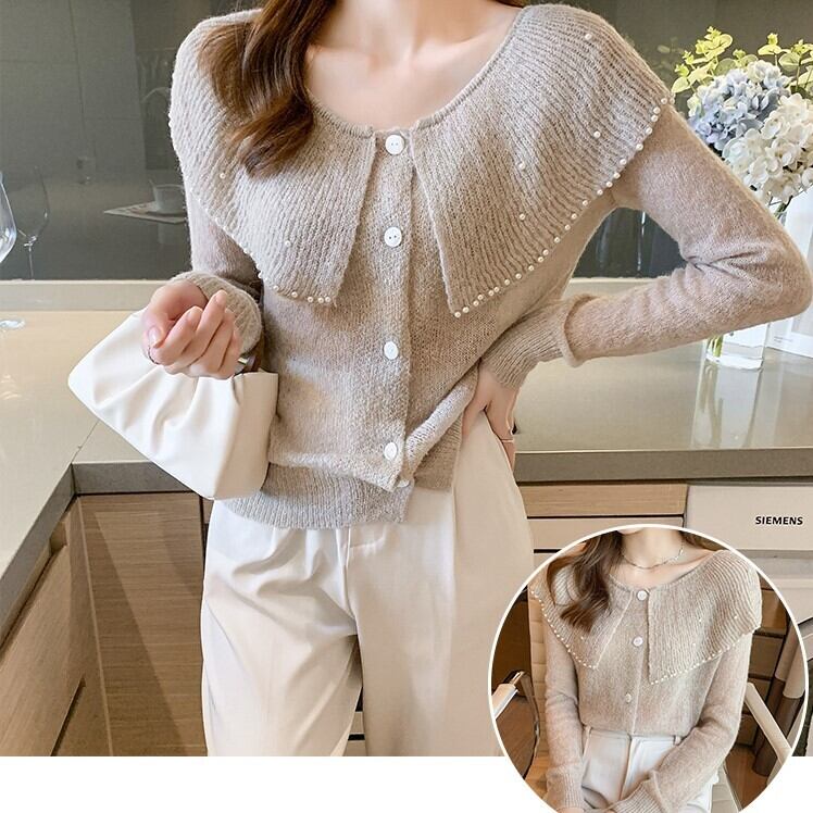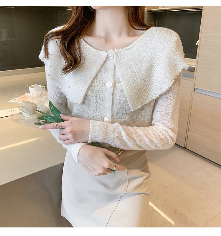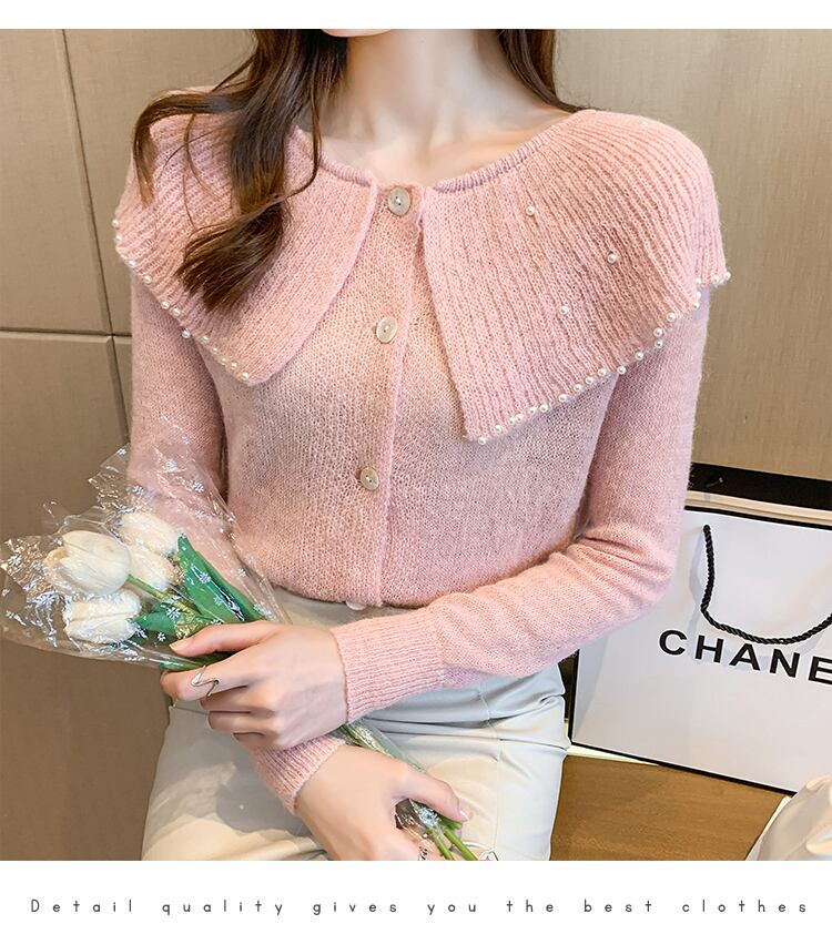 レディース トップス 長袖ニット カーディガン 襟付き ビッグカラー ラウンドネック ニット ふわふわ ビーズ 3色展開 ピンク オフホワイト 白 ベージュ 春 秋 冬 普段着 着回し 10代 20代 30代 40代 おしゃれ 上品 清楚 エレガント キュート シンプル カジュアル かわいい 大人かわいい モテ 甘アイテム フェミニンスタイル オフィス 通勤 通学 デート コーディネート 女性 トレンド さわやか 素材感