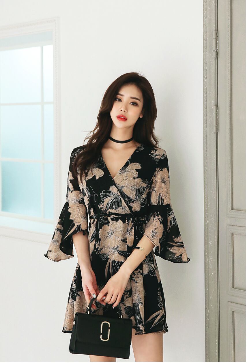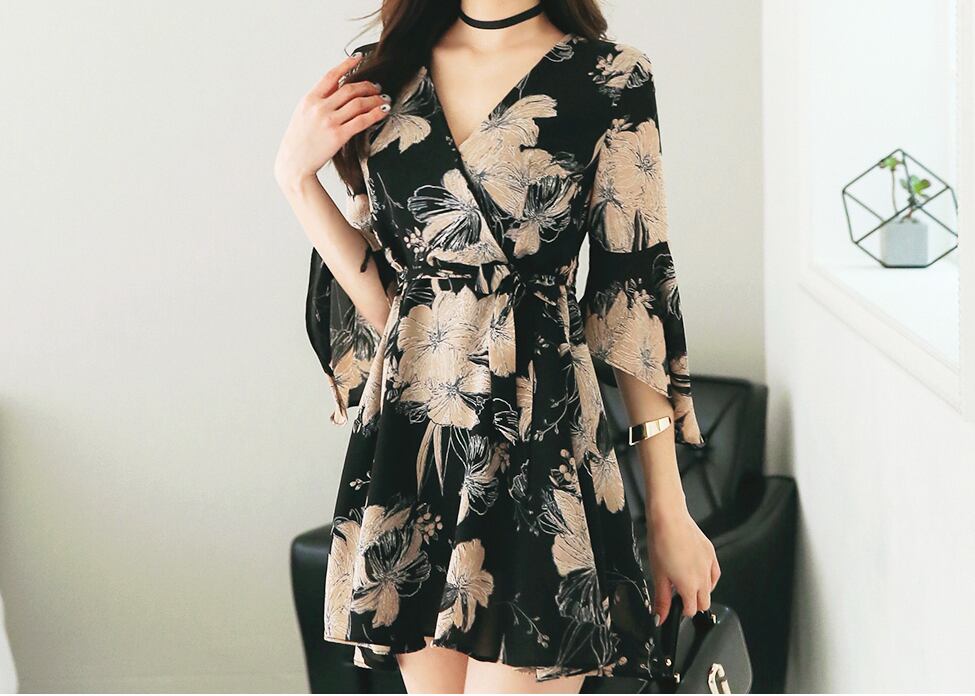 ワンピース レディース フリルスカート フレア 七分袖 七分袖ワンピース フレアスカート フレアスリーブ ショートスカート ミニ丈 ショート丈 シフォンワンピース ミニワンピ フレア 花柄 Vネック ミドルウエスト 大人 大人っぽ 大人女子 大人可愛い 女っぽ 上品 きれいめ 可愛い お洒落 こなれ感 スリム レトロ エレガント セクシー ふんわり 美スタイル クール 女性 ブラック 黒 サイズ S M L 軽い 薄手 ファッション お出かけ デート 女子会 二次会 旅行 休日 パーティー