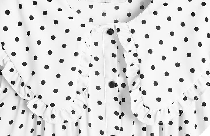 トップス シャツ ブラウス 袖あり 半袖 5分袖 Uネック 襟付き ビッグカラーワイド シフォン フリル 前開き かわいい 大人可愛い シンプル カジュアル おしゃれ お洒落 ラフ ラブリー キュート ガーリー 柄 ドット柄 水玉 春 夏 秋 10代 20代 30代 40代 レディース ママ マタニティ OL 通勤 学生 通学 デート お出かけ お泊まり 休日 旅行 着回し 普段使い 重ね着 体系カバー 送料無料 サイズ フリーサイズ ゆったり 色展開 白 ホワイト 黒 ブラック モノトーン