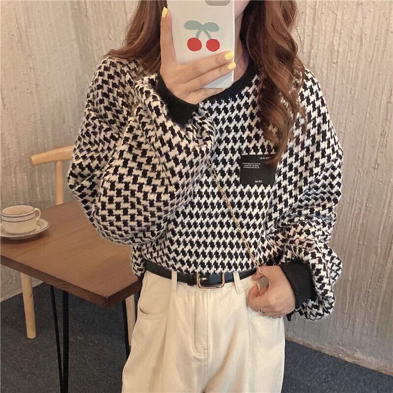 トップス ニットソー セーター プルオーバー 袖あり ボリューム袖 長袖 Uネック ラウンドネック 襟なし ワンポイント かわいい 大人可愛い シンプル カジュアル おしゃれ お洒落 レトロ 大人女子 こなれ感 ラフ 柄 チェック柄 秋 冬 10代 20代 30代 40代 レディース ママ ママコーデ オフィス ビジネス OL 通勤 学生 通学 デート 休日 休日コーデ 旅行 着回し 着まわし 普段使い 重ね着 韓国 韓国系 楽ちん 定番 送料無料 サイズ フリーサイズ 黒 ブラック モノトーン