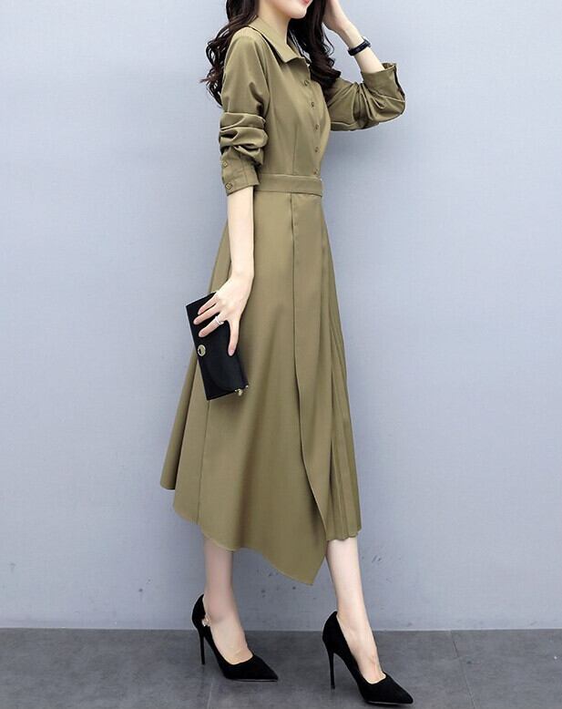 レディース ワンピース スカート ロング 膝丈 膝丈スカート シャツワンピース 袖あり Vネック かわいい 大人可愛い カジュアル 大人 上品 おしゃれ お洒落 きれいめ 大人女子 大人っぽ 女っぽ こなれ感 20代 30代 女性用 通勤 オフィス OL デート ランチ 二次会 お出かけ 公園デビュー 女子会 休日 旅行 イベント 着回し 普段使い ファッション コーデ スタイル 楽ちん モテ 体系カバー プレゼント ギフト トレンド インスタ映え ゆったり ラフ カーキ ブラック 送料無料