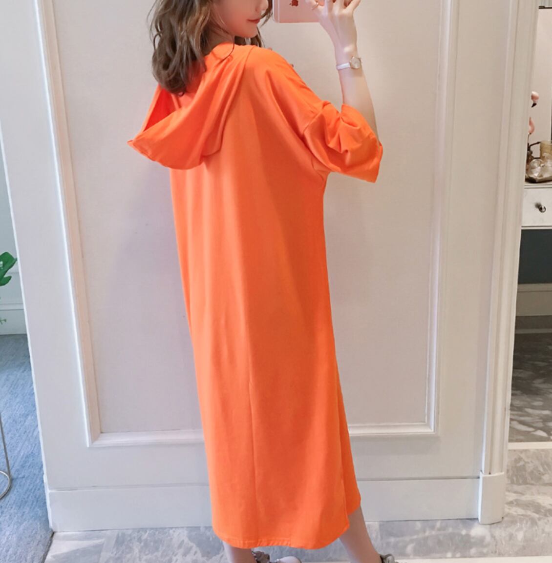ワンピース パーカー ロング丈 袖あり 半袖 Vネック ストレート フード付き プルオーバー かわいい 大人可愛い きれいめ シンプル カジュアル 大人 上品 おしゃれ お洒落 大人可愛い 大人女子 こなれ感 ラフ スポーティー ガーリー ルーズ 個性的 主役級 とろみ感 抜け感 無地 夏 10代 20代 30代 レディース 女性用 学生 通学 デート お出かけ アウトドア 旅行 着回し 普段使い お揃い 双子 韓国系 オルチャン ファッション コーデ スタイル 体系カバー M L XL 2XL オレンジ