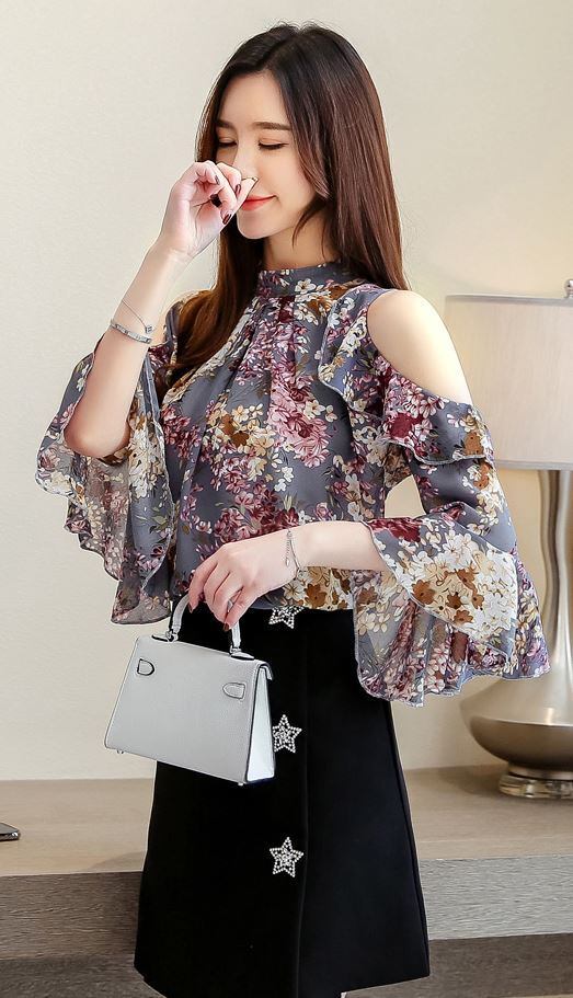 トップス レディース シャツ ブラウス プルオーバー シフォン 半袖 フレア袖 ホルターネック スタンドカラー 花柄 フラワー 小花柄 オープンショルダー レトロ トレンド ゆったり 大きいサイズ フリル 体型カバー 薄手 大人可愛い かわいい きれいめ フェミニン ガーリー 清楚 上品 韓国 おしゃれ 春 夏 秋 2022 新作 送料無料 お出かけ デート オフィス OL 通勤 オフィスカジュアル お呼ばれ 普段着 着回し ピンク グレー S M L XL 2XL 20代 30代 40代