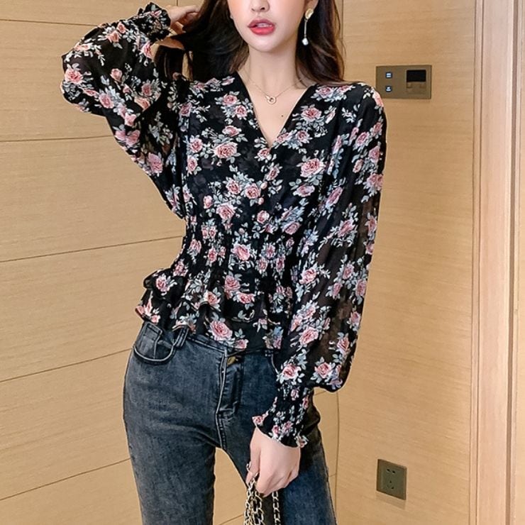 レディース トップス プルオーバー ブラウス 長袖 襟付 Vネック ショート丈 ミディ丈 ふんわり パフスリーブ 花柄 上品 清楚 シンプル 体型カバー 着瘦せ ウエストマーク スタイルアップ 定番 かわいい 大人可愛い 大人女子 女の子 こなれ感 きれいめ カジュアル エレガント ナチュラル おしゃれ お洒落 かっこいい ラブリー コーデ 着回し 通学 通勤 女子会 食事会 デート お出掛け OL 10代 20代 30代 40代 春 夏 S M L XL ピンク 黒 ブラック 送料無料