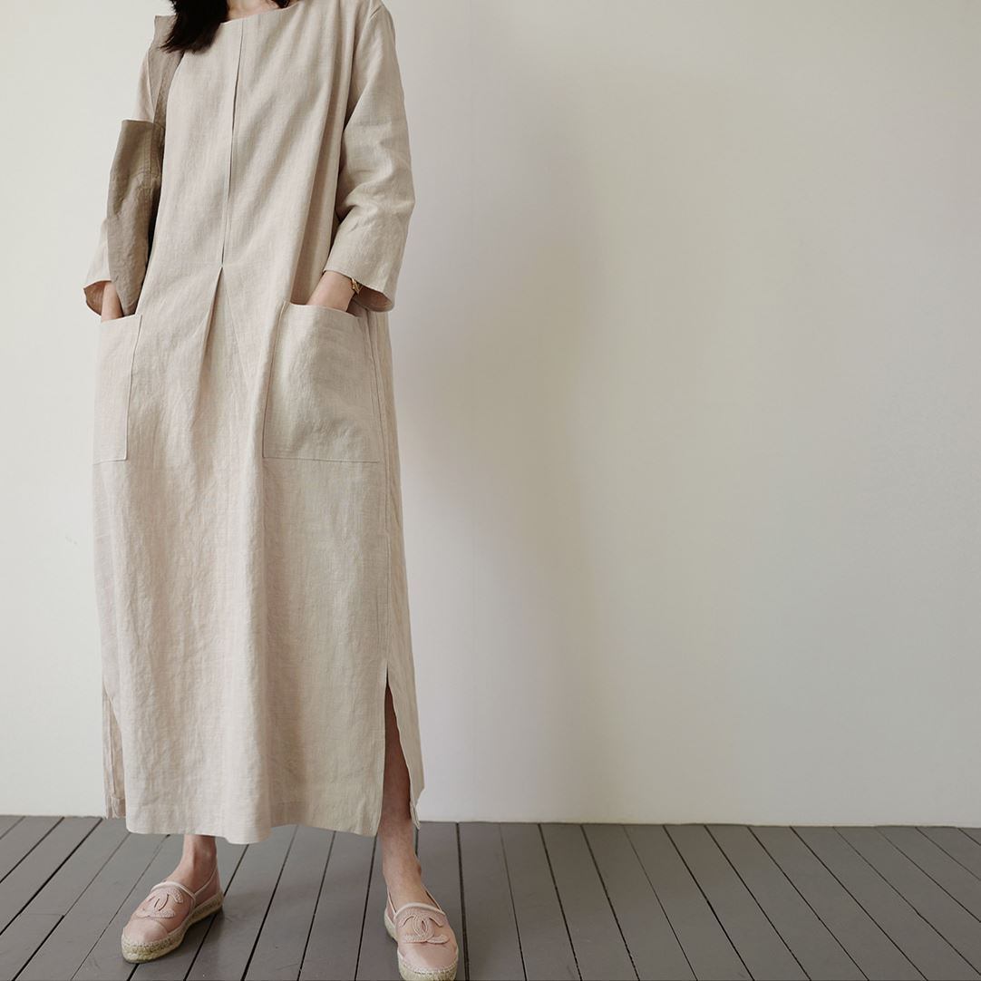 ワンピース レディース ロングワンピース リネンワンピース リネン 麻 混紡 ロング ロング丈 ボートネック 七分袖 無地 レトロ バルーンシルエット トレンド ゆったり 大きいサイズ 体型カバー 二の腕カバー サイドスリット おしゃれ 大人 大人可愛い カジュアル 清楚 フェミニン 韓国 春 夏 秋 2022 新作 送料無料 お出かけ デート 女子会 普段着 デイリー 着回し 旅行 休日 リラックス ショッピング ラフ ベージュ ピンク 10代 20代 30代 40代 50代 S M L XL