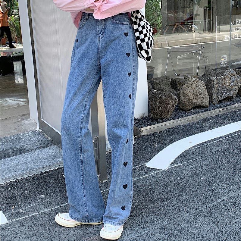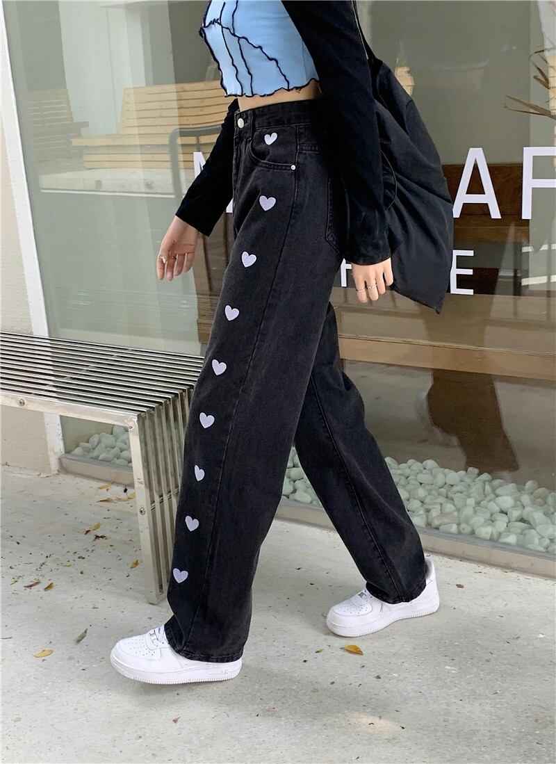 ボトムス パンツ レディース ズボン デニムパンツ ワイドパンツ バギーパンツ デニム ハートライン 刺繍 ハイウエスト かわいい 大人可愛い カジュアル キュート スポーティー おしゃれ お洒落 かっこいい 大人女子 ラフ ルーズ 個性的 クール こなれ感 春 夏 秋 冬 オールシーズン シーズンレス お出かけ 旅行 運動 スポーツ ダンス衣装 着回し 普段使い 韓国系 送料無料 新作 S M L XL 2XL 3XL 4XL 大きいサイズ 黒 ブラック 青 ブルー 10代 20代 30代