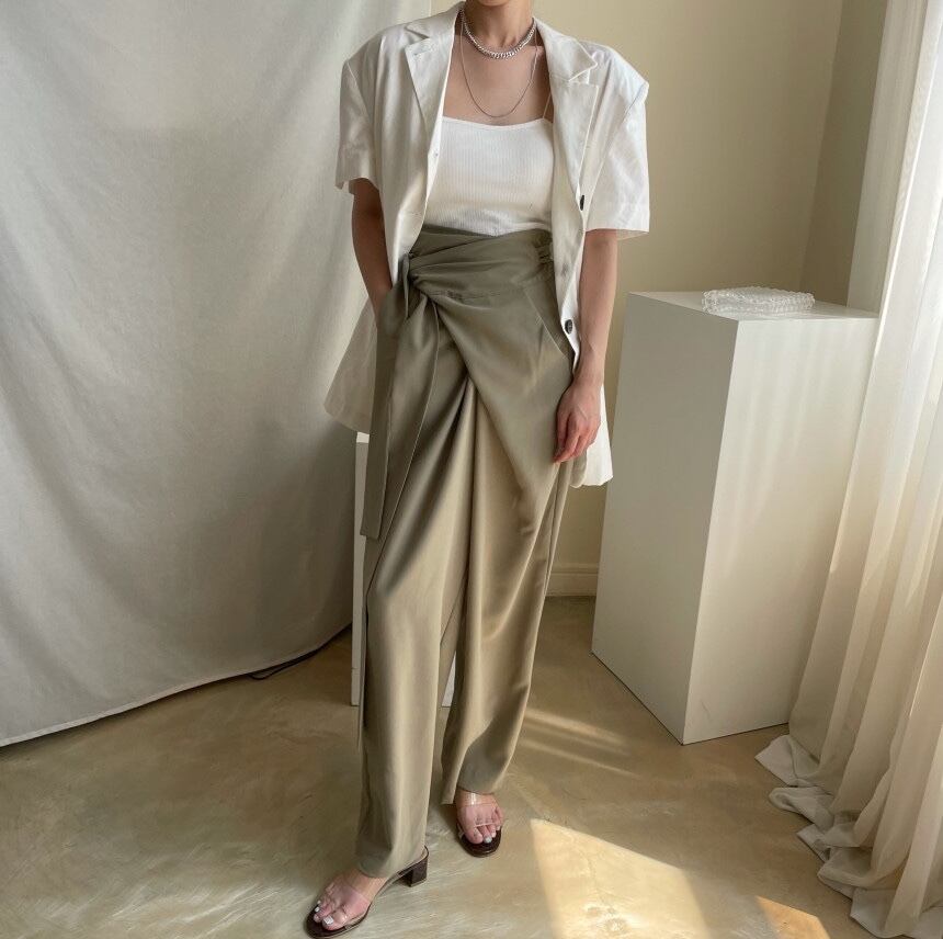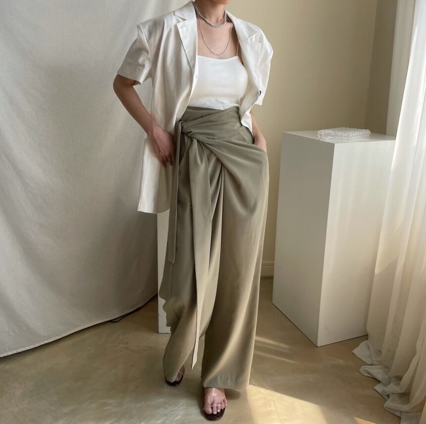 ラップパンツ風でウエストをリボンで結ぶデザインが新鮮で、ざっくりとした着こなしができます。