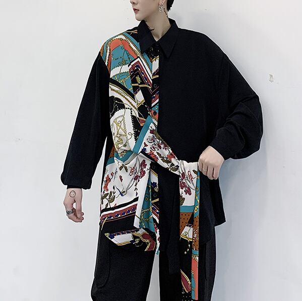 トップス レディース シャツ プリントシャツ カジュアル プリント柄 切り替え オーバーサイズ ビックシルエット ゆったり ラフ 楽チン ウエストタイ メンズライク クール ボーイズスタイル スカーフ柄 お洒落 おしゃれ 大人可愛い 大人女子 こなれ感 ラフ ルーズ 個性的 クール エレガント 主役級 存在感 とろみ感 抜け感デート お出かけ 休日 旅行 着回し 普段使い 重ね着 個性的 存在感 韓国系 オルチャン 体型カバー 細身え アウトドア モダン ファッション 送料無料 M L XL ブラック