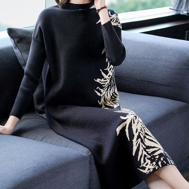 ワンピース レディース ママ ニットワンピース ニット ジャガードニット 膝下 ミモレ ミモレ丈 プルオーバー ボートネック 長袖 袖あり 花柄 植物柄 レトロ ベーシック トレンド Iライン ゆったり 大きいサイズ オーバーサイズ フレア 体型カバー 着痩せ あったか セミフレア おしゃれ 大人 大人可愛い カジュアル 清楚 上品 とろみ 韓国 きれいめ セレブ キュート 春 秋 冬 送料無料 お出かけ デート 着回し フォーマル セレモニー 黒 ブラック 20代 30代 40代 50代 M L XL
