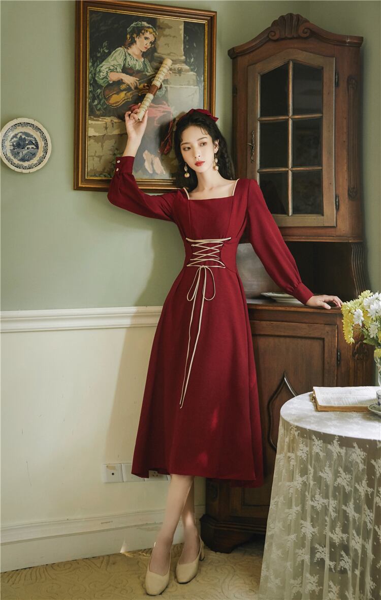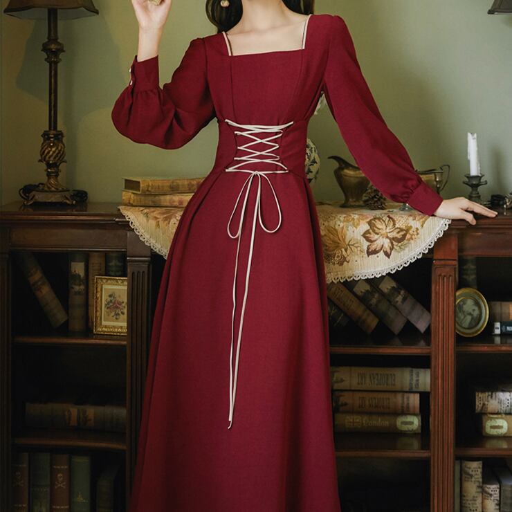 レディース ワンピース ワンピ ドレス 長袖 レトロ レースアップ Aライン 膝下 スクエアカラー リボン 姫 エレガント 上品 パーティー お呼ばれ 2次会 こなれ感 カジュアル フェミニン エレガント ヘビロテ かわいい カジュアル 大人可愛い 可愛い 高見え シンプル おしゃれ お洒落 大人女子 ラブリー キュート ガーリー 甘アイテム 10代 20代 30代 40代 オフィス ビジネス OL 通勤 学生 通学 デート お出かけ 女子会 休日 旅行 着回し 普段使い 大人 流行 トレンド 送料無料