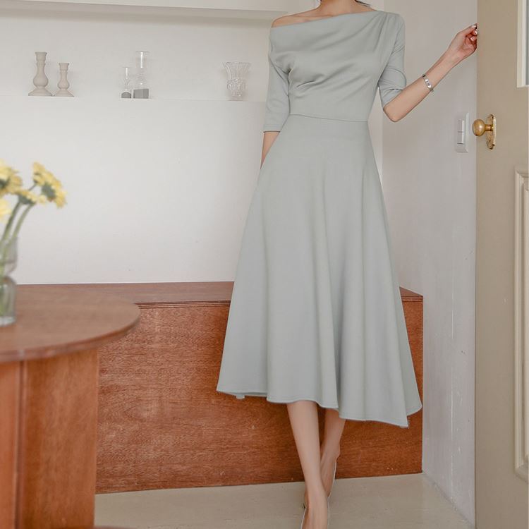 ワンピース レディース ドレス フレアワンピース ワンピドレス コットン 膝丈 ひざ丈 膝下 七分袖 プルオーバー 無地 ハイウエスト トレンド ひらひら Aライン 大きいサイズ フレア スリム 体型カバー スタイリッシュ オケージョン おしゃれ 大人 大人可愛い 清楚 フォーマル フェミニン 上品 韓国 きれいめ キュート シンプル 春 夏 秋 シーズンレス 送料無料 結婚式 二次会 入学式 卒業式 お呼ばれ 着回し パーティー セレモニー 灰色 グレー 20代 30代 40代 50代 S M L XL