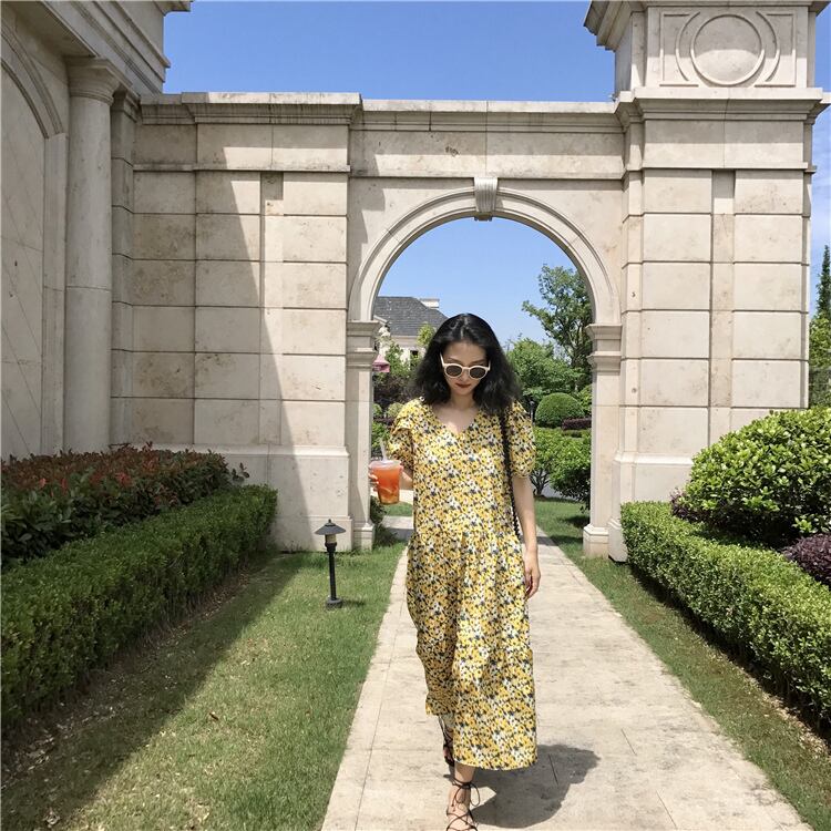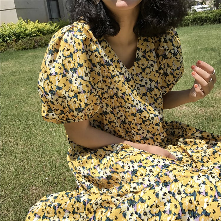 スカート ワンピース オールインワン 膝下 ミモレ ミモレ丈 ロング ロング丈 袖あり 半袖 パフスリーブ Vネック 襟なし ワイド Aライン かわいい 大人可愛い シンプル カジュアル おしゃれ お洒落 ラフ キュート ルーズ 柄 花柄 小花柄 フラワー 夏 10代 20代 30代 40代 レディース ママ 学生 通学 デート お出かけ 女子会 お泊まり 休日 リゾート 旅行 海 楽ちん 体型カバー 送料無料 サイズ S M L ゆったり ゆったりシルエット ゆる 色展開 黄色 イエロー ビタミンカラー