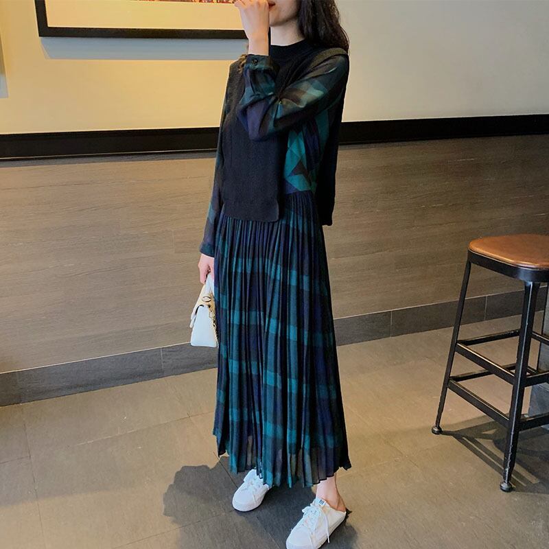 ワンピース レディース チェック柄 ベスト付きワンピース プリーツスカートニットベスト ロング ハイネック 長袖 切り替えデザイン ハイウエスト かわいい 大人可愛い シンプル カジュアル おしゃれ お洒落 レトロ ラフ ラブリー 春 秋 冬 10代 20代 30代 レディース ママ 通勤 学生 通学 デート お出かけ 女子会 休日 リゾート 旅行 普段使い デイリー オルチャン 韓国 ファッション 10代 20代30代 大きサイズ S M L XL 2XL3XL 4XL 5XL ブラック 送料無料