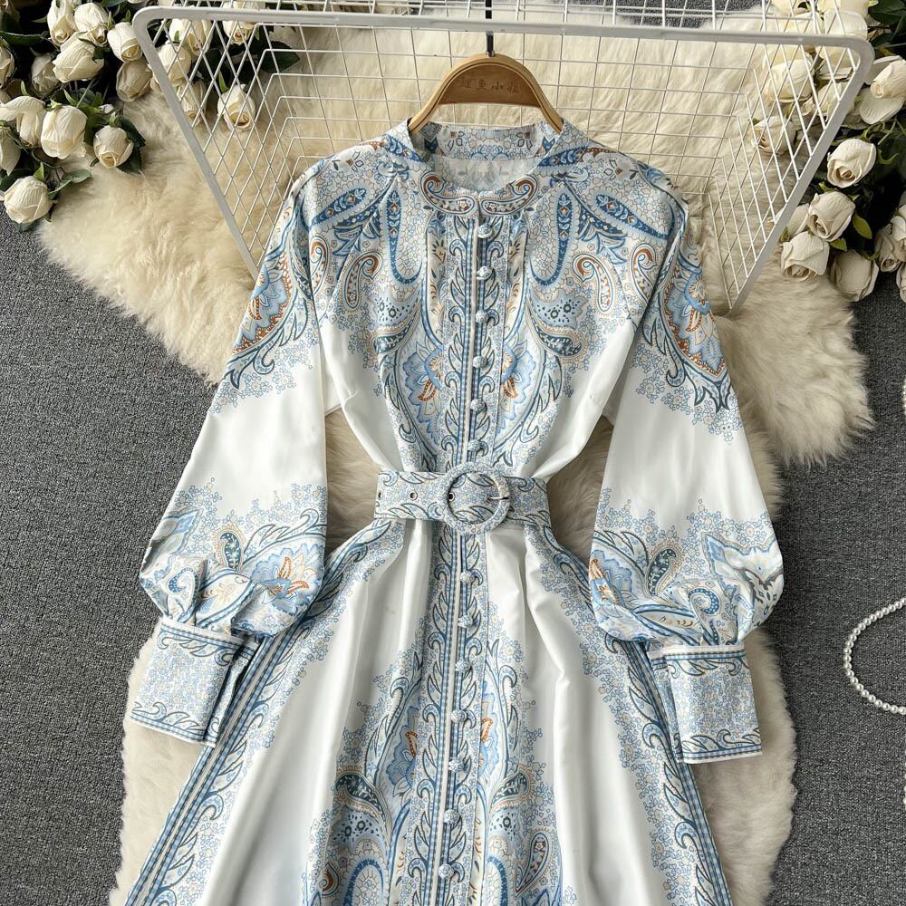 スカート ワンピース フレアスカート シャツワンピース フレアワンピース シャツワンピ 袖あり 長袖 ボリューム袖 パフスリーブ Uネック ラウンドネック 襟なし フレア Aライン ベルト ウエストマーク 前開き かわいい 大人可愛い きれいめ シンプル カジュアル 上品 おしゃれ お洒落 レトロ 柄 リーフ柄 ボタニカル 20代 30代 40代 レディース ビジネス OL 通勤 学生 通学 デート 休日 イベント 旅行 普段使い サイズ S M L XL 2XL 2色展開 白 ホワイト 黒 ブラック